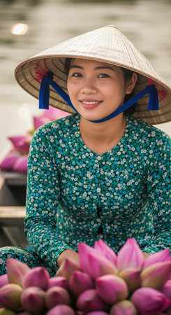 Portrait of a beautiful vietnamese woman in a conical hat selling lotus flowers. This young Asian vendor is smiling from her boat.