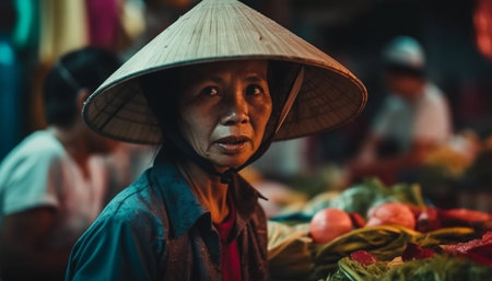 A woman wearing a traditional conical hat stands in front of a vibrant display of colorful lanterns and pottery. The scene captures the essence of chinese culture and its rich artistic heritage. ai generated.