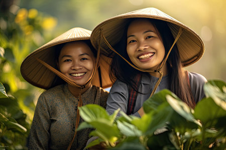 Happy Vietnamese female farmers in the coffee plantation. Generative Ai