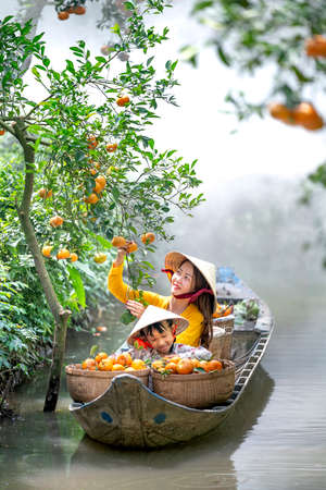 Sa Dec town, Dong Thap province, Vietnam - February 7, 2021: Farmers harvesting tangerine on a boat in Sa Dec town, Dong Thap province, Vietnam