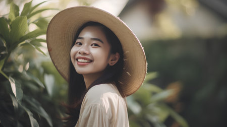 Asian female tourist in a fashionable straw hat smiling, promoting beauty and skincare during a sunny summer vacation.