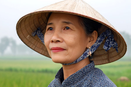 Elderly Vietnamese woman farmer smiling, wearing a traditional conical hat in a rural rice field