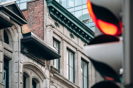 Historic building facade and red traffic light in downtown Montreal