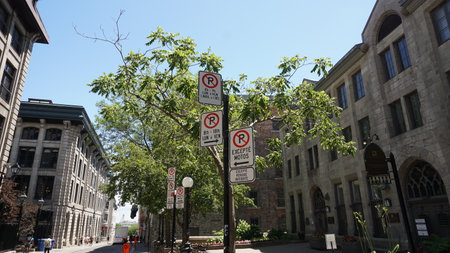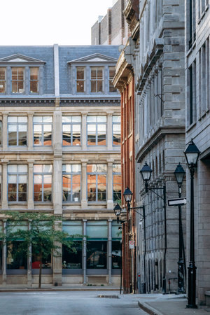 Montreal, Canada - August 11, 2025: Quiet street with historic stone and brick buildings in downtown Montreal, Quebec