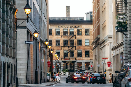 Montreal, Canada - August 11, 2025: Evening cityscape with historic Lovell and Son building, vintage street lamps, cars and people on rue le Moyne in Old Montreal