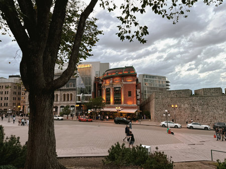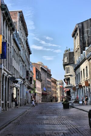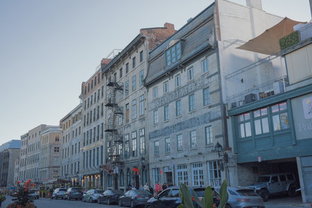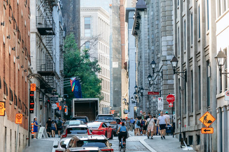 Montreal, Canada - August 13, 2025: old stone house and city street scene in Old Montreal, summer afternoon