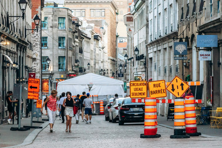 Montreal, Canada - August 11, 2025: Construction zone with orange Rue Barree and local traffic signs, people walking on closed street in downtown Montreal