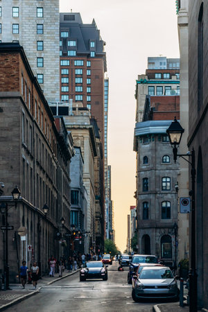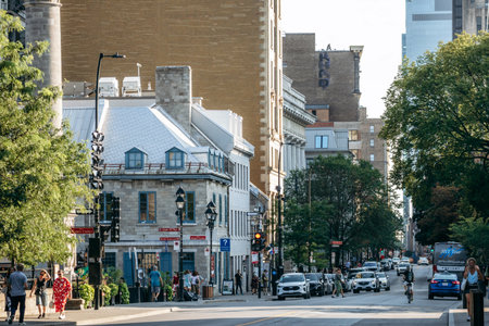 Montreal, Canada - August 14, 2025: downtown street in Montreal with historic facades, cars, and architectural diversity
