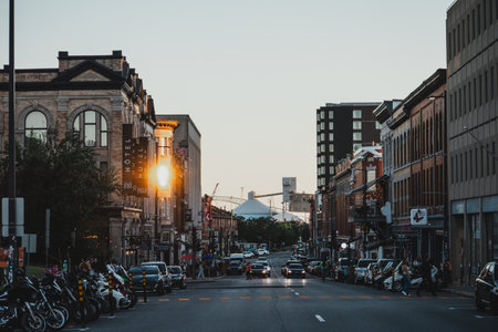 Montreal, Canada - August 11, 2025: Busy downtown street with historic buildings, cars and people in city center at sunset, Montreal, Quebec