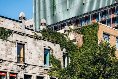 Montreal, Canada – August 12, 2025: Architectural fragments of historic building facades along Saint-Laurent Boulevard in Montreal.