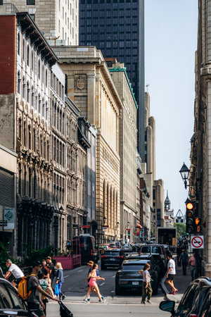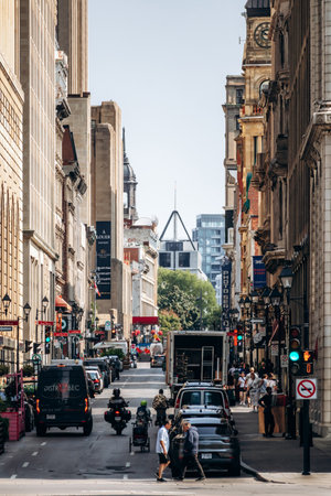 Montreal, Canada - August 14, 2025: downtown pedestrian and vehicle traffic on Rue Saint-Antoine Ouest with historic city architecture