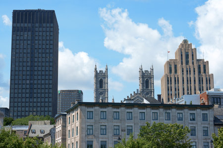 Montreal, Canada - July 26, 2008: glimpse of downtown Montreal with Aldred Building on the right, the towers of Notre Dame Cathedral in gothic revival style by architect James O'Donnel and some modern skyscrapers.