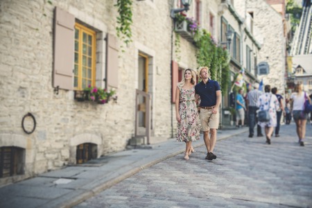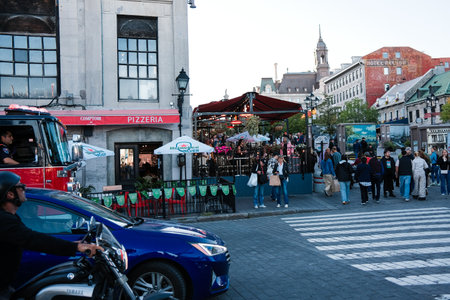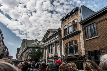 Tourists in the tourist and cultural heart of Old Montreal. View of the street in Montreal, Quebec.
