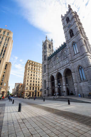 MONTREAL, CANADA - NOVEMBER 4, 2018: Notre Dame Basilica in the Old Montreal and its iconic towers, with the Aldred Building in backgground. The basilica is the main cathedral of Montreal, and a touristic landmark