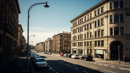 Urban street with buildings and parked cars