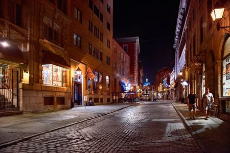 Old town Montreal at famous Cobbled streets at twilight in Canada