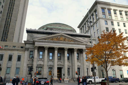 Quebec, Canada - October 26, 2019 - The view of Bank of Montreal surrounded by striking colors of fall foliage