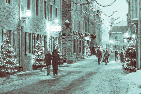 Christmas lights and decorations adorn beautiful and historic Quebec City on Christmas Eve 2021.