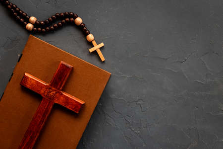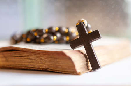 Bible book with wooden christian rosary beads with cross