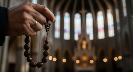 Hand holding ornate prayer beads in majestic cathedral interior with colorful stained glass windows creating atmospheric bokeh lighting for spiritual and religious concepts