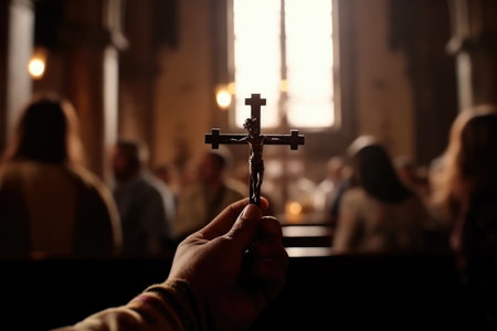 Man holding wooden cross in church, closeup. Faith and hope concept