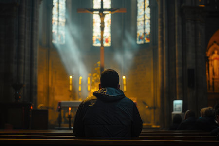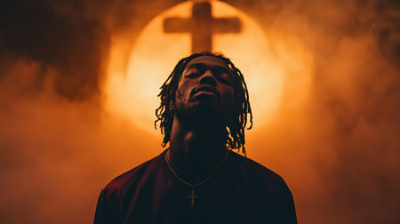 A contemplative figure stands under a glowing cross, surrounded by misty atmosphere during a dramatic lighting at dusk