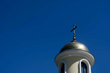 The dome of an Orthodox chapel against the blue sky. Gilded dome with a cross in the clear summer sky. Christian symbol of faith. Religious topics.