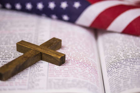 A holy Christian cross laying on an open Bible with an American flag in the background.