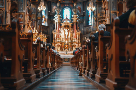 Congregation attends a church service as sunlight filters majestically through the stained glass windows, creating a serene atmosphere.