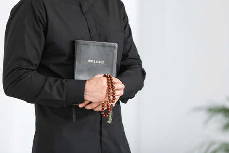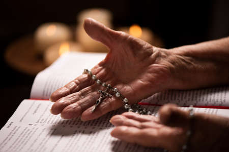 Hands of priest in black apparel holding rosary beads and open Gospel while reading verses and explaining them during sermon