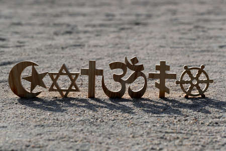 Religious symbols on sand. Christianity, Islam, Judaism, Orthodoxy Buddhism and Hinduism. Interreligious or interfaith concept.