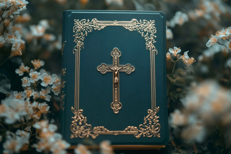 Green bible with golden crucifix and decorations lying on small white flowers in a natural environment
