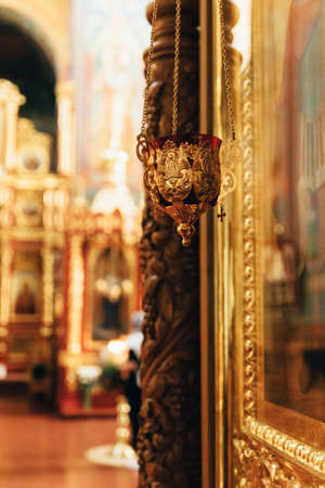 Close up detail view of christian hanging oil candle of brass and glass, hanging in church in front of religious iconography and iconostasis