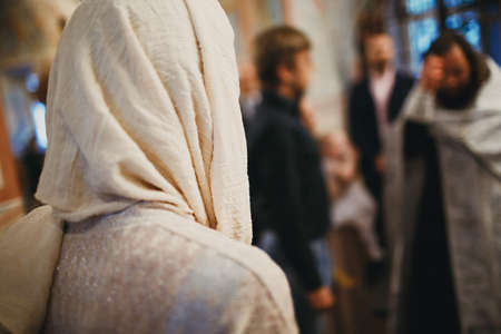 Orthodox Christian priest and parishioner praying in the church