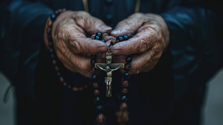 Image black and white woman hand holding rosary against cross and praying to God at church.