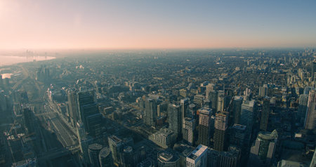 Melbourne city at sunrise, looking north over the parks and bustling new developments shortly after sunrise