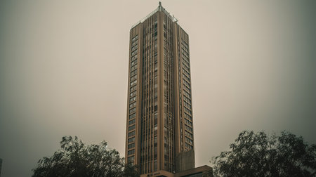 From a low angle perspective, a towering glass skyscraper pierces the overcast sky, its modern facade reflecting the cool tones of dusk.