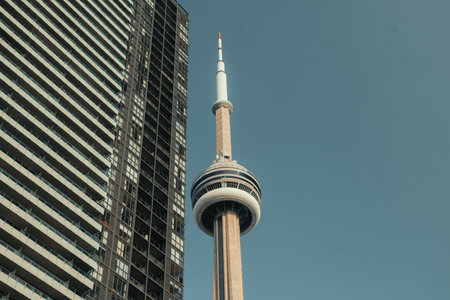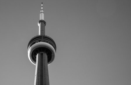 TV Tower in Toronto, Canada. Black and white. Vertical. Modern architectural building detail - a tower on a clear blue sky background. general panoramic view with copy space