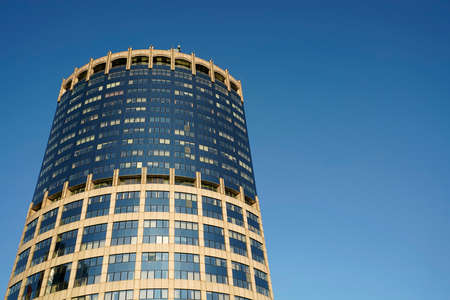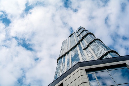 Low angle view of modern skyscraper in Hong Kong. Office building in city on blue sky background. Central Business District. Glass commercial skyline building in Moscow City