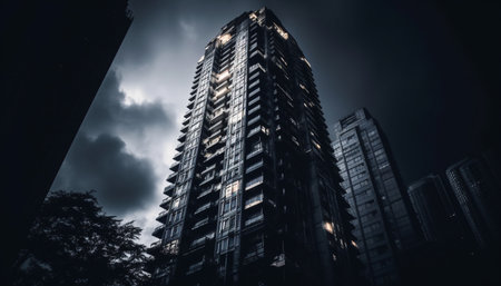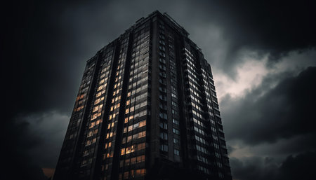 Futuristic skyscraper silhouette illuminates city skyline at dusk generated by artificial intelligence