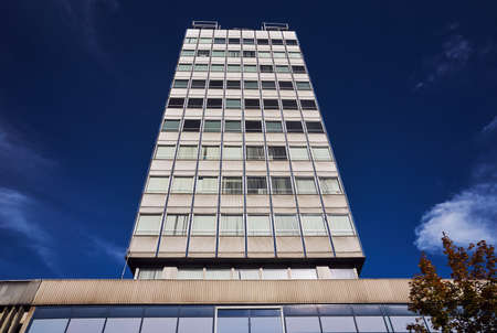Tall office building with copy space on white sky background