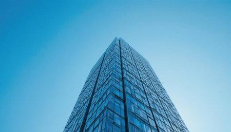 A striking view of a high-rise office building reaching towards a blue sky, showcasing modern architecture and reflective glass. Ideal for business and urban themes.
