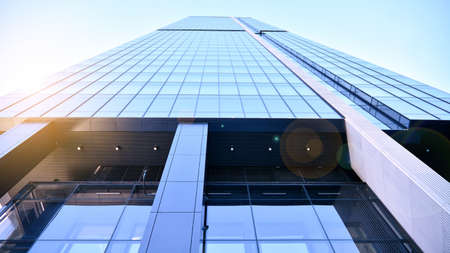 Modern glass facade against blue sky. Bottom view of a building in the business district. Low angle view of the glass facade of an office building.