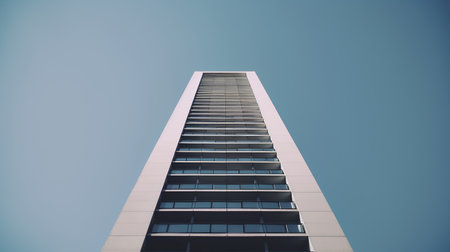A modern sleek apartment building rises sharply against a clear sky, showcasing its glass facade and contemporary design. Perfect for urban lifestyle themes.