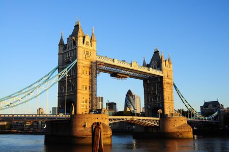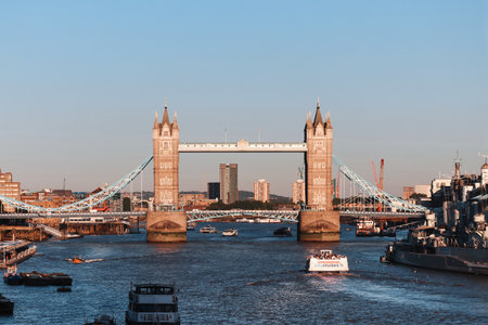 Tower Bridge, one of London's famous bridges and one of many must-see landmarks in London, in warm sunset light. Wide side view