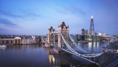 England, London: Aerial view of Tower Bridge illuminated at colorful sunset with City skyline reflecting on River Thames, a popular tourist attraction and iconic landmark in London, United Kingdom