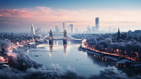 Panoramic view of a winter London city skyline at dusk, with the city lights reflecting off the icy surfaces and creating a magical, urban winter wonderland