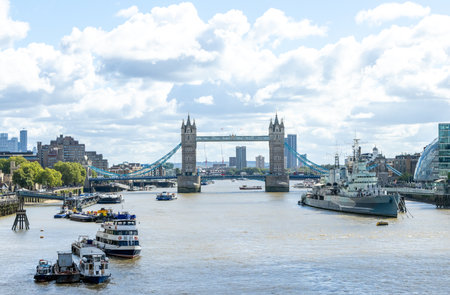 London, United Kingdom - October 18, 2016: View to the Tower Bridge and the Hms Belfast Warship on the River Thames in London, England