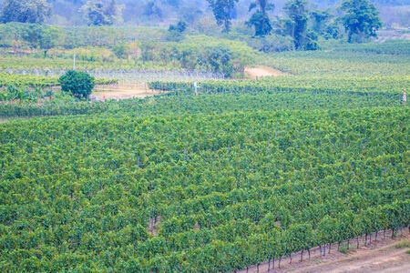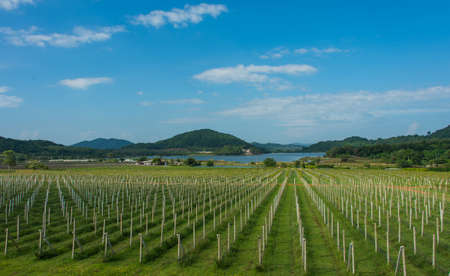 View of the vineyard during warm and sunny weather near Kyjov, South Moravia, Czech Republic. Grape field growing for wine.