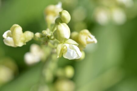 bean flower in garden with green leaves on background. The beginning of flowering beans in the garden